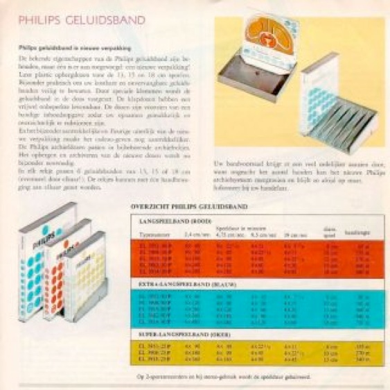 Philips voegde bij de banden een klein foldertje waarop men het bandenaanbod kon aflezen inclusief de exacte speelduren per spoor en per snelheid.